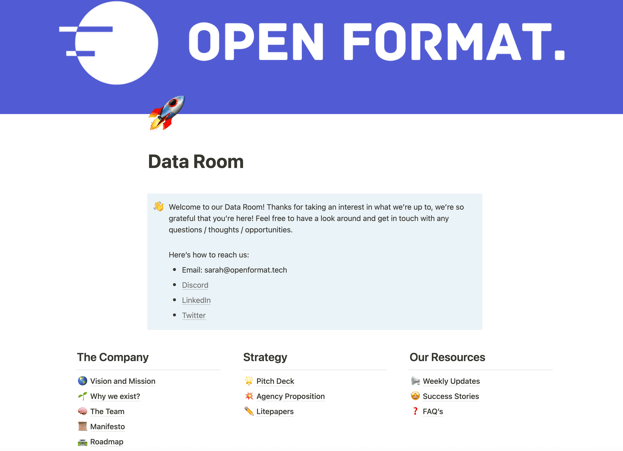 Notion. I realise I am late to this. Shared documents is what we use it for most. I love it, or I did until we had over 100 documents all in a long list now needing some organisation, the problem there lies with me though, not Notion. We have an open Data Room on there for transparent and accessible updates on OPENFORMAT.
