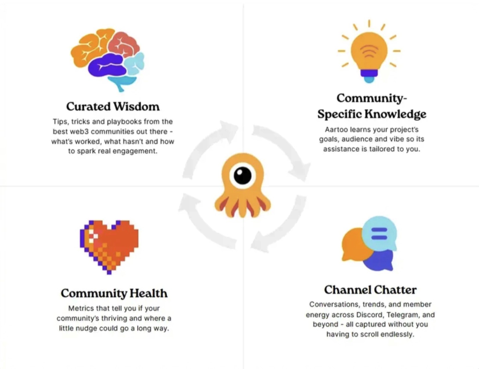 Aartoo has a sophisticated memory, which brings together highly specific knowledge about your community, broader wisdom about web3 communities and their best practices plus much more.
