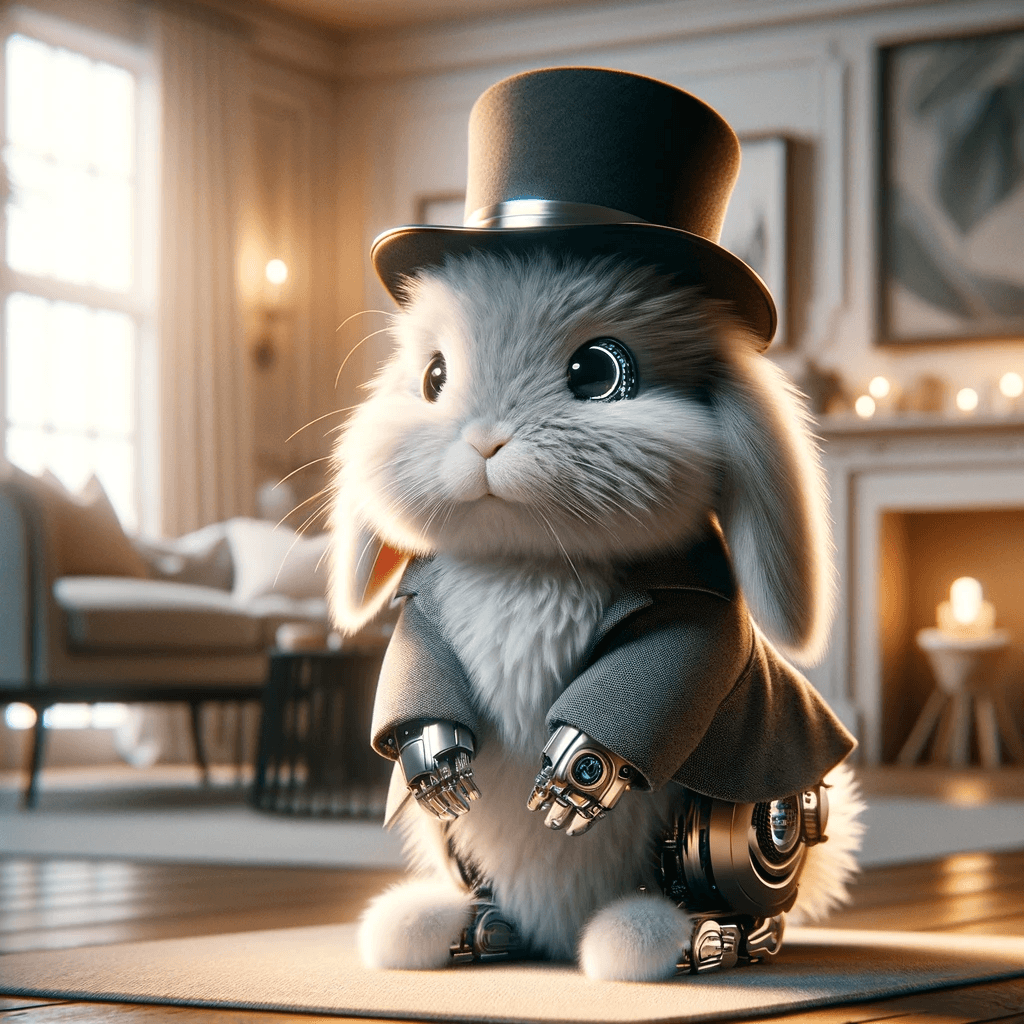 Prompt (generated using Dalle-3): “A highly adorable and ultra-cute version of a realistic high-tech rabbit with cybernetic enhancements and a top hat, in a house interior. This rabbit should be the epitome of cuteness, with extremely soft, fluffy fur, incredibly large and bright eyes, and a small, adorable nose. Its expression should be heartwarming and its posture inviting and playful. The house setting should complement this cuteness, with a warm, cozy atmosphere, soft lighting, and inviting furniture. The aim is to create a rabbit that embodies peak cuteness, irresistibly charming and delightful in every aspect.”