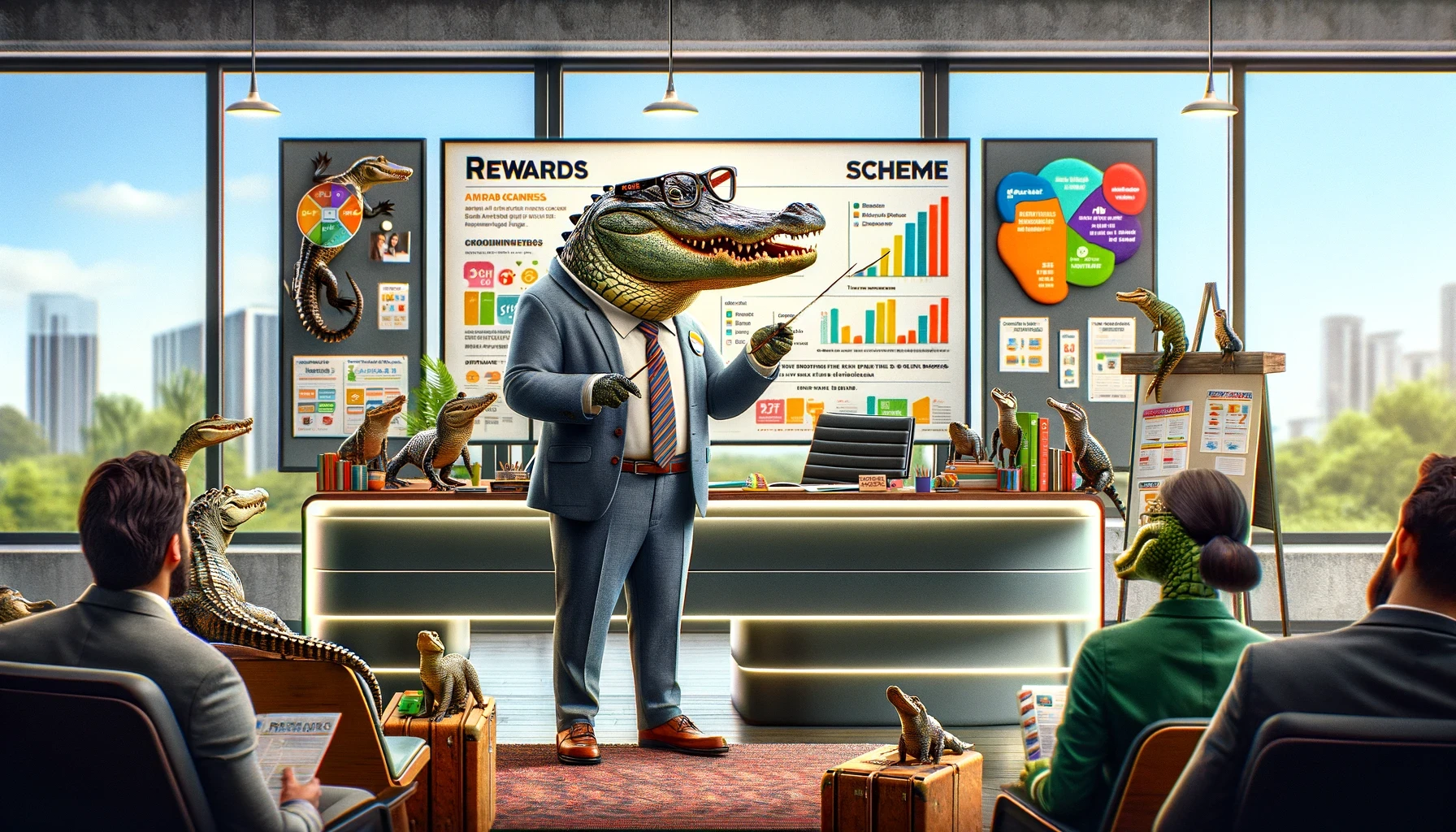 Prompt (generated using Dalle-3): “Imagine an amusing scene where an alligator, anthropomorphized and dressed in business attire, is managing a rewards scheme. This alligator stands behind a sleek, modern desk in an office environment, surrounded by colorful posters and charts illustrating the rewards program. The alligator has a friendly demeanor, wearing glasses and holding a pointer stick to explain the benefits of the rewards scheme to an attentive audience of various animals, also anthropomorphized, who are potential participants. The office is filled with promotional materials like brochures and a large monitor displaying the rewards scheme details, such as points for purchases, loyalty bonuses, and exclusive offers. The scene captures a humorous and creative twist on a corporate rewards program presentation, emphasizing the alligator's role as the enthusiastic scheme runner.”