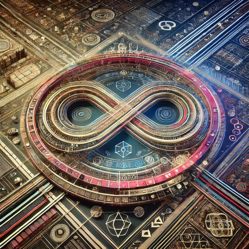 Image generated by Dall-E 2 using the prompt: “Abstract digital art representing 'the infinity game,' with a clear infinity loop structure at the center, highlighting cultural heritage elements like ancient symbols and architectural motifs around the edges. Include intricate, endless rails that guide the eye through the loop, symbolizing pathways and choices. Represent rich AI agents as geometric, glowing forms interacting within the infinity shape, showing intelligence and strategy. The color palette should mix traditional and futuristic tones, creating a balance between historical depth and advanced technology, giving the impression of an eternal, interactive game.”