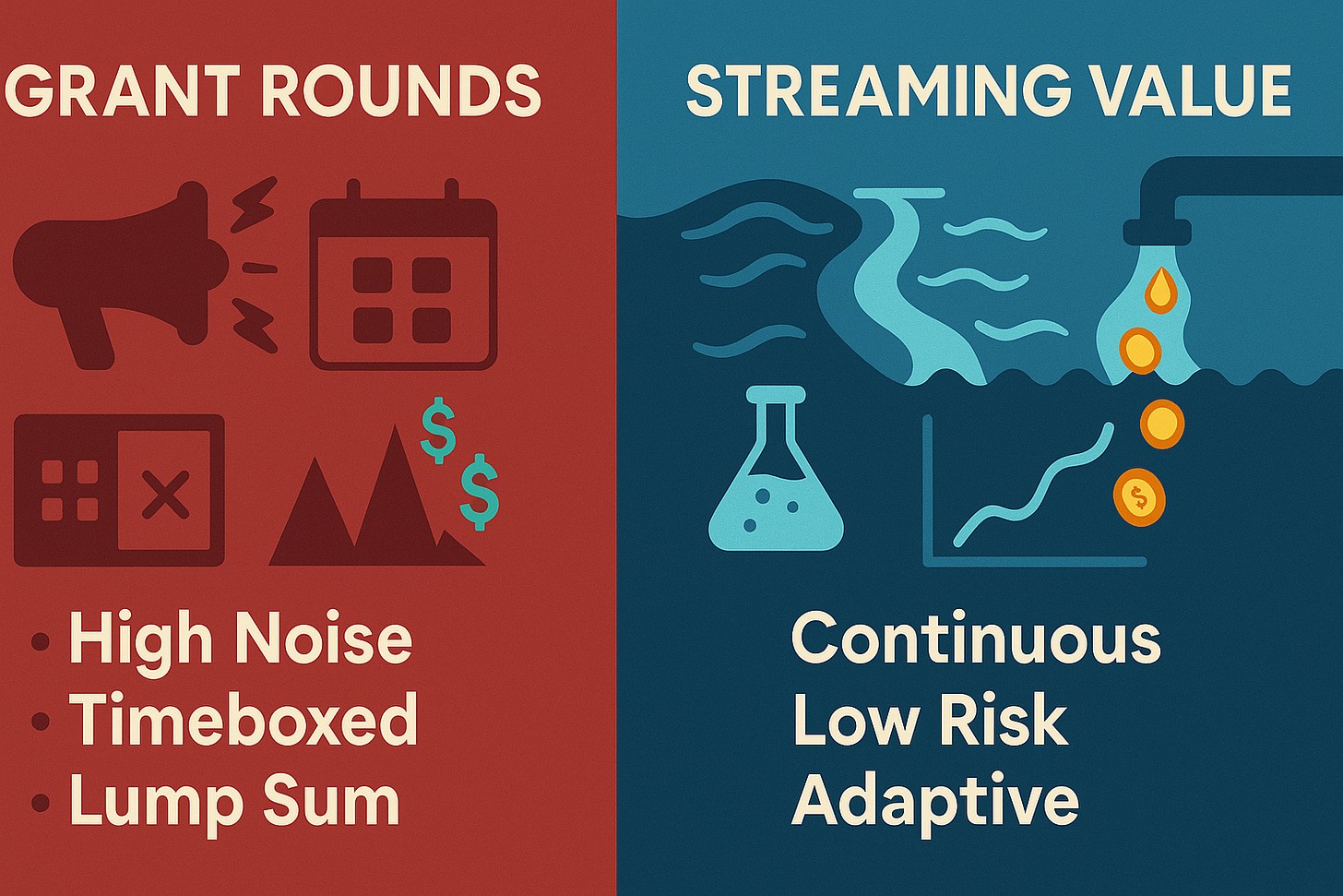 That’s exactly what this podcast explores: how to replace the two-week “attention-battle-royale” of traditional grants with an always-on money stream—a protocol that moves value as steadily as code commits, value is created and contributions are made.